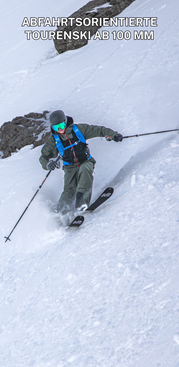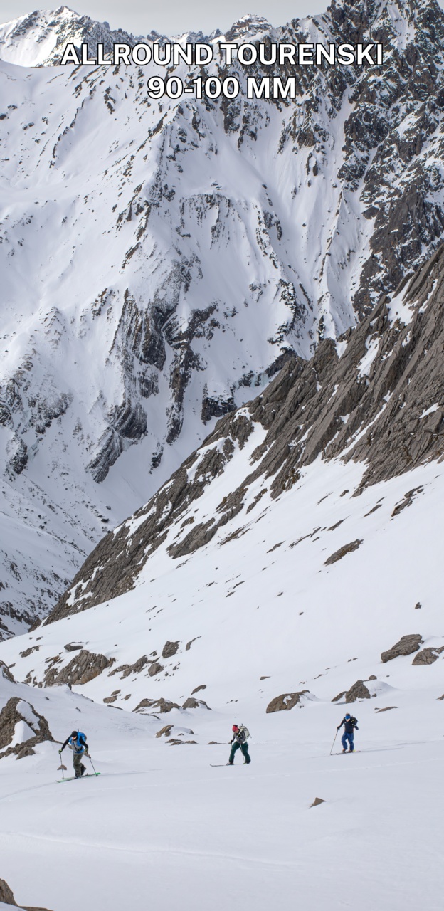 Die abfahrtsorientierten Ski mit einer Breite in der Mitte ab ca. 100 mm sind für die Traumtiefschneetage geeignet und werden auch oft in der Nähe der Skigebiete eingesetzt, wenn die Anstiege meist kürzer ausfallen und das Gewicht der Ski nur eine untergeordnete Rolle spielt. Die zweite Kategorie im Test stellen die Alleskönner, die Skitouren-Allrounder dar, mit einer Breite von ca. 90 bis 100 mm. Die Testklasse der aufstiegsorientierten Ski haben wir mit 80 bis 90 mm Breite in der Mitte der Ski definiert, wissend, dass durchaus auch schmalere Tourenski, insbesondere bei fitnessorientierten Skitourengehern, immer beliebter werden.