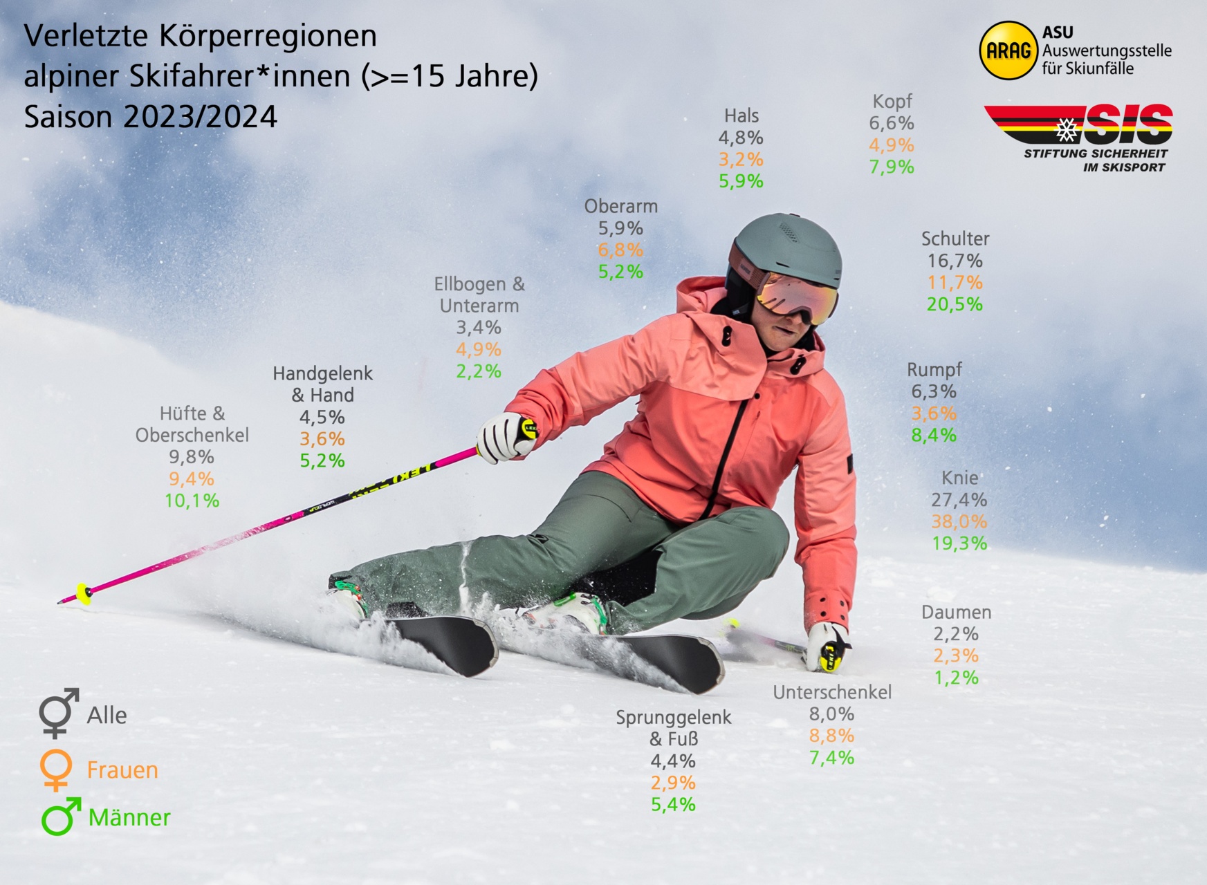 Das Risiko für Knieverletzungen ist im Vergleich zur Vorsaison wieder gestiegen: Es erhöhte sich von 2,70 auf 3,01 pro 1.000 Skifahrer*innen. Auch Verletzungen im Bereich Schulter/Oberarm verzeichneten einen moderaten Anstieg von 2,61 auf 2,64 pro 1.000 Skifahrer*innen. In den anderen Körperregionen zeigt sich kein einheitliches Bild.
